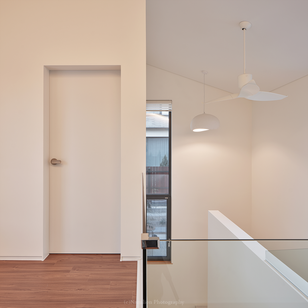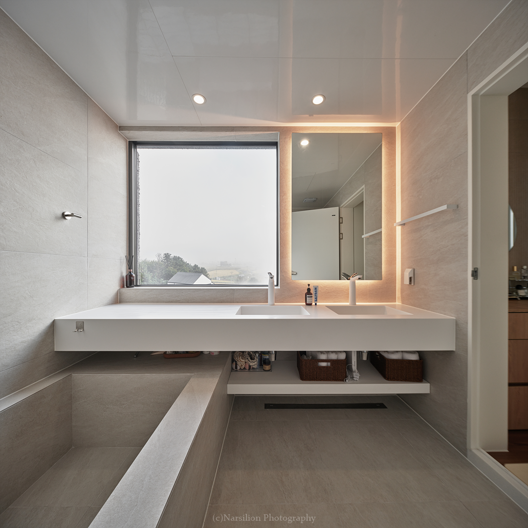 이 주택은 채광과 프라이버시의 균형을 고려하여 설계되었습니다. 북동 방향의 조망을 최대한 활용하면서도, 거주자의 프라이버시를 보호하기 위해 창문의 위치와 크기를 신중하게 결정했습니다. 특히 2층 중정의 설계는 남측 채광을 침실로 유입시키면서도 외부의 시선을 차단하는 역할을 합니다. 이러한 설계는 거주자가 자연광을 충분히 누릴 수 있도록 하면서도 개인 공간의 프라이버시를 유지할 수 있게 합니다.