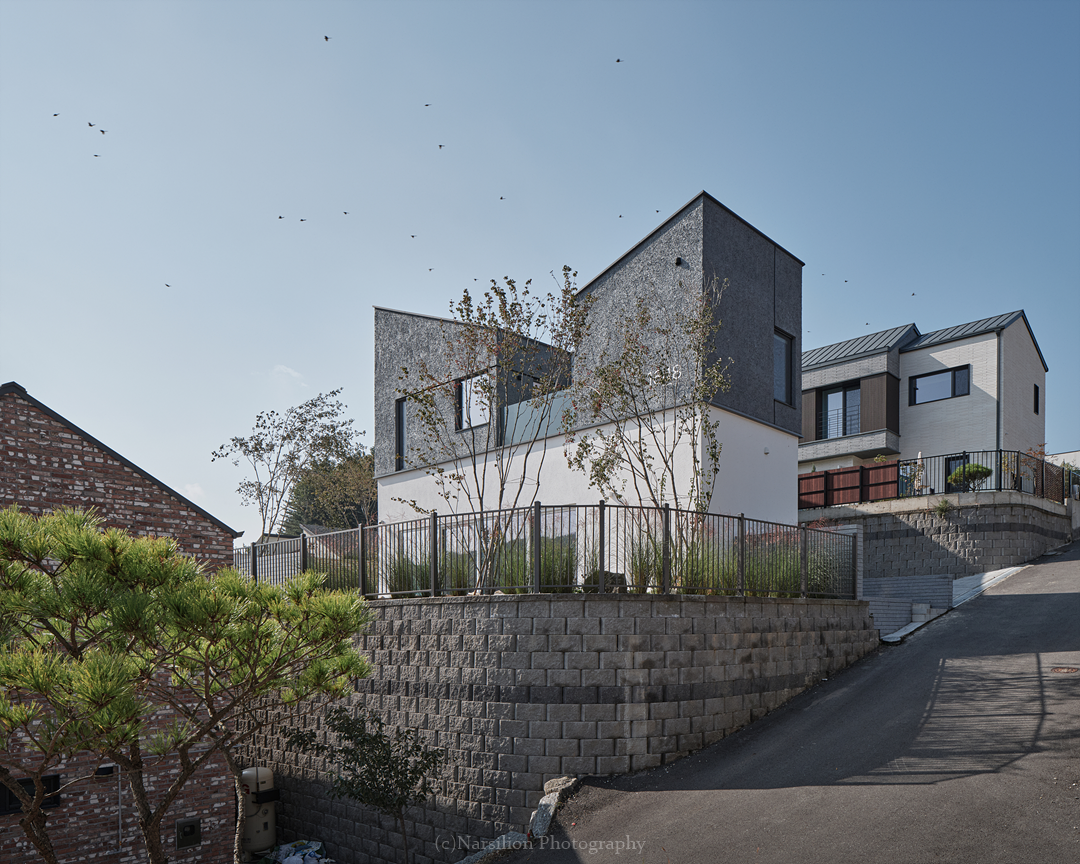 경사지 대지의 특성을 최대한 활용한 점도 주목할 만합니다. 대지의 경사는 북동측에서 남서측으로 올라가며, 이는 주택의 전체적인 배치와 구조에 큰 영향을 미쳤습니다. 건축물의 자중을 줄이기 위해 스틸하우스 공법을 사용하고, 지내력 확보가 어려운 점을 고려하여 경사지 대지에 적합한 설계를 도입했습니다. 이러한 접근은 안정성과 기능성을 동시에 확보한 것입니다.