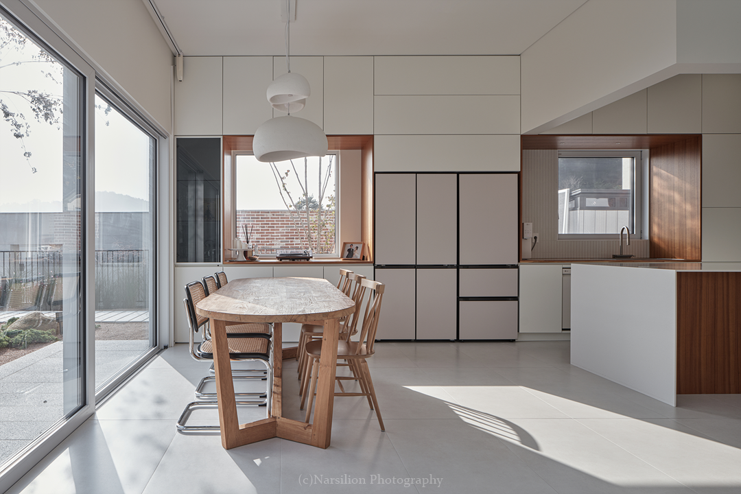 1층은 거실과 주방이 위치하며, 길게 선형적인 모습을 띄고 있습니다. 거실과 주방은 가로로 긴 창문을 통해 외부 마당과 연결됩니다. 이러한 창문은 내외부의 확장성을 고려하여 슬라이딩 창문으로 설계했습니다. 주방은 큰 아일랜드가 중앙에 위치하여 가족이 함께 모여 음식을 준비하고 대화를 나눌 수 있는 공간으로 계획되었습니다.