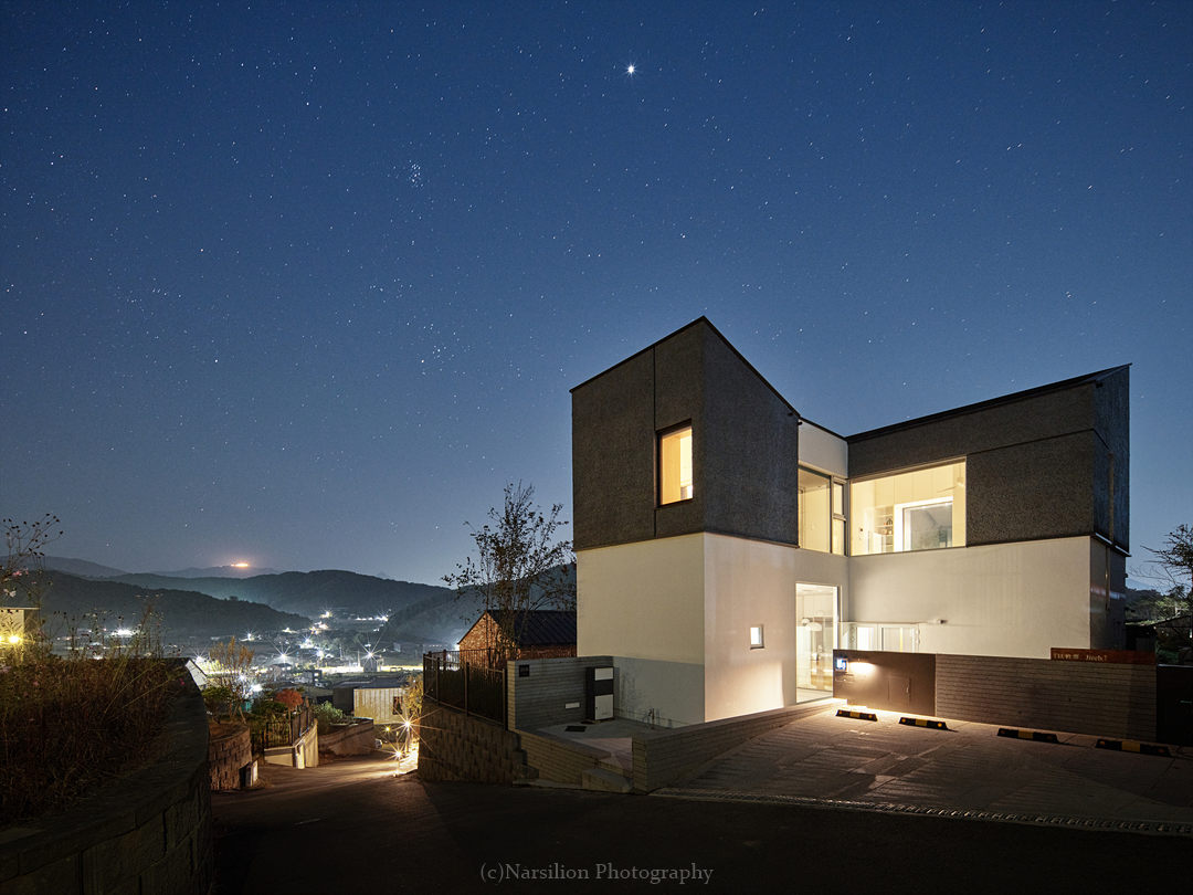 이 주택은 경기도 양평군 청계리에 위치한 경사지에 자리하고 있습니다. 대지는 북동측에서 남서측으로 경사가 있어 채광은 불리하지만, 북동방향의 전원 풍경을 한눈에 담을 수 있는 조망을 제공합니다. 대지의 특성상, 건축물의 자중을 줄여야 했고, 이를 위해 스틸하우스 공법을 사용했습니다.