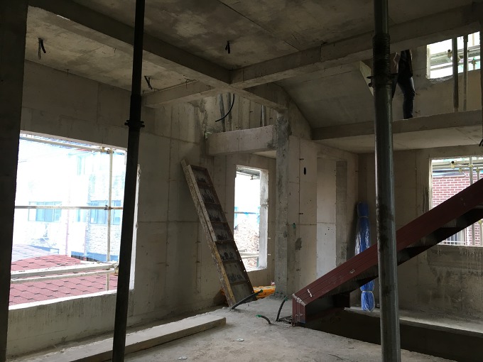 현장에 오면 그동안 도면에서 마주했던 공간의 깊이와 너비를 실제로 체감합니다. 고민의 흔적들은 고스란히 공간 속에 투영되어 나타납니다. 거주자의 정주를 위해 만든 40cm 아래 거실도 만나게 되고, 외부와 내부를 자연스레 연결하는 웰컴공간도 만나게 됩니다. 공간을 실제로 체감하는 것과 더불어, 구조체 역활을 수행하는 골조(철근콘크리트)의 타설상태를 육안으로 확인하며, 주요구조체와 개구부의 사이즈를 검측합니다.