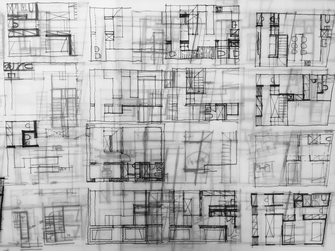 평면을 계획하면서 단면을 고민하는 일은 왼손과 오른손이 각기 다른방향에서 하나의 작업을 하는 것과 같다. (양손잡이인 필자를 이야기하는 것은 아님) 특히, 수평적 한계가 명확한 협소주택에서는 평면과 단면을 함께 고민하는 것이 맞다. 트레싱지 위 평면을 위한 스케치가 하나둘씩 겹쳐질수록 선들은 교차되고 깊어지며, 예상했던 단면이 구체화 된다.