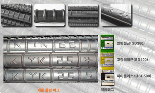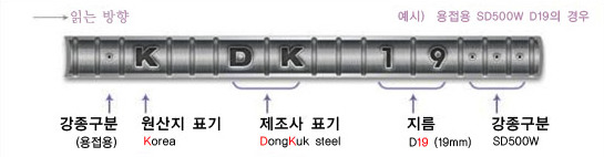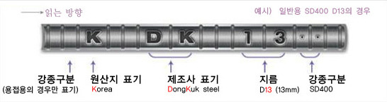 표기의 맨 앞에 *표시는 용접봉 철근을 표기하며, 그 다음 영문은 제조국가를 명기한다. 예를 들어, K는 korea를, J는 japan을 C는 china의 제조국을 나타낸다.