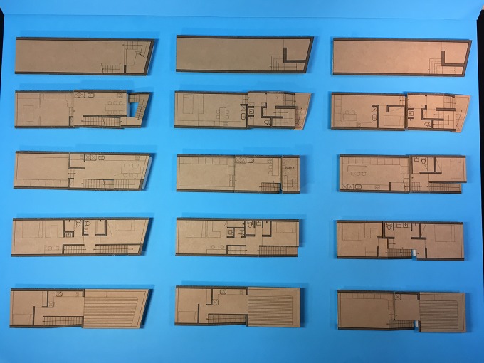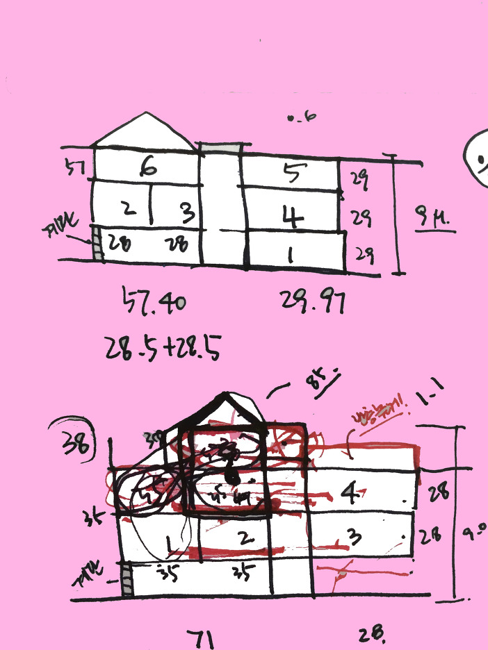 이전에 다양한 대안설정이 있었다. 타운하우스처럼, 단독형 6가구 제안도 있었고, 이웃한 대지를 구매해서 건축범위를 확장하는 대안도 있었다. 물론 현 대지에서 이러쿵, 저러쿵 대안도 많았다. 중요한 지점은 평범하지 않은 대지의 특성 때문에 (일반적인 건축환경으로는 풀지 못한다.) 이곳만의 특별한 무언가, (건축주의 요청처럼) 사업성이 확보되는 대안이 필요했다.