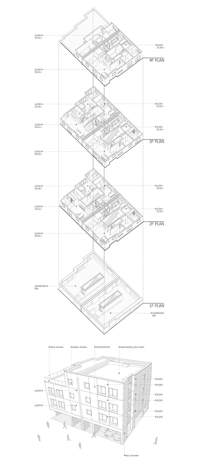 1층은 주차를 위해 전면에 필로티 형식을 취하며, 후면에 1가구가 자리한다. 임대세대 3가구가 자리한 2층과 주인세대, 임대세대, 도합 2가구가 자리한 3층으로 구성된다.