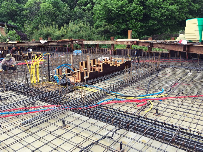2층 바닥 철근콘크리트 공정이 진행중이다. 골조를 완성하기 위해 철근배근 작업과 거푸집 제작을 콘크리트 타설 전에 선행한다. 벽체 골조는 철근배근 후 거푸집을 제작하고, 바닥골조는 거푸집 제작 후 철근을 배근한다.