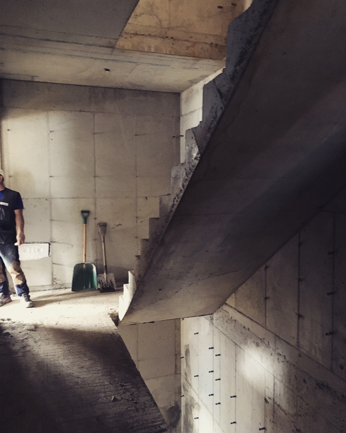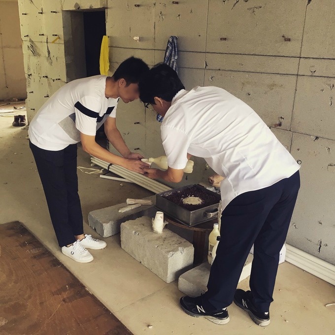 2층 바닥 철근콘크리트 공정이 진행중이다. 골조를 완성하기 위해 철근배근 작업과 거푸집 제작을 콘크리트 타설 전에 선행한다. 벽체 골조는 철근배근 후 거푸집을 제작하고, 바닥골조는 거푸집 제작 후 철근을 배근한다.