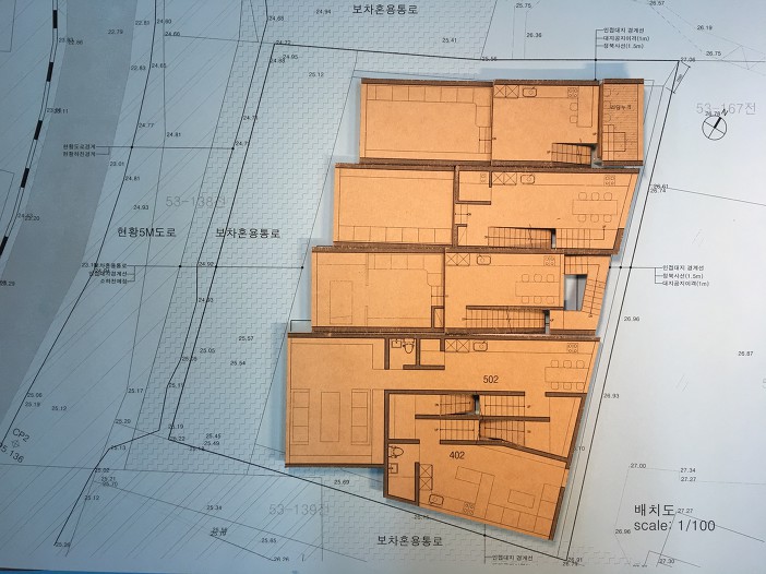 이전에 다양한 대안설정이 있었다. 타운하우스처럼, 단독형 6가구 제안도 있었고, 이웃한 대지를 구매해서 건축범위를 확장하는 대안도 있었다. 물론 현 대지에서 이러쿵, 저러쿵 대안도 많았다. 중요한 지점은 평범하지 않은 대지의 특성 때문에 (일반적인 건축환경으로는 풀지 못한다.) 이곳만의 특별한 무언가, (건축주의 요청처럼) 사업성이 확보되는 대안이 필요했다.