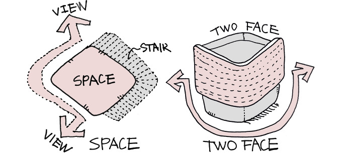 설계를 진행하면서 프로그램과 동선의 우선순위를 정하게 된다. 사용자에 따라 적정비율이 있지만, 정주공간 또는 전용공간을 최대한 확보하고, 계단을 포함한 동선을 최소화 하는 것이 답에 가까운 설계다. 그럼에도 불구하고 공간이 막히지 않도록 (공간이 정체되지 않도록) 원활한 동선을 공간에 할애하는 것은 매우 중요하다. 계단을 너그러이 봐야, 공간과 공간 사이에 장면이 만들어지고, 기능적으로 편리한 사용이 가능하다.