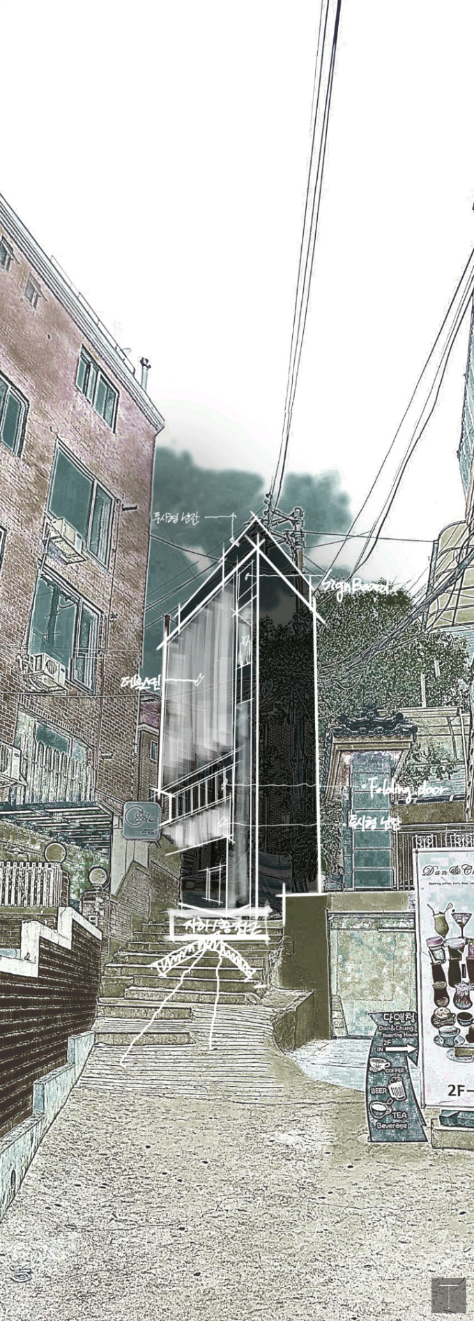 - 이태원 지역의 상가 유동량과 주 출입 계단의 내부공간 환경을 고려하여 북측 주거건물과 간섭을 최소화하기 위한 차면이 가능하며 주출입 공간의 환기와 채광이 가능한 입면계획
