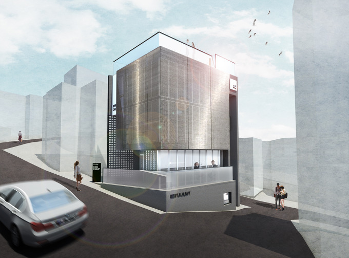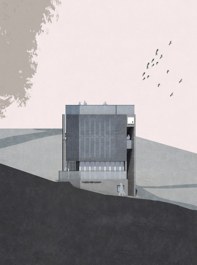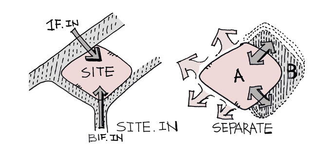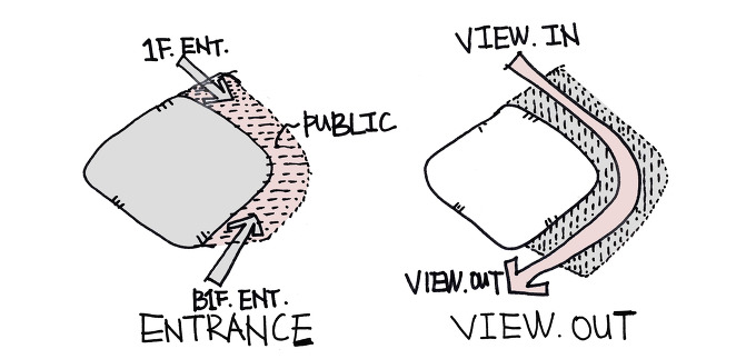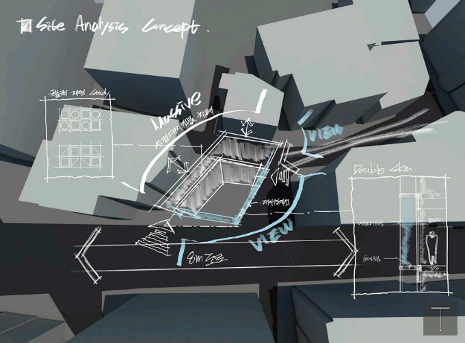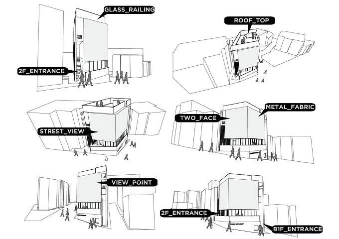 레벨이 다른 2개의 도로로 접근 가능한 동선을 확보하고, 인지성이 높은 지점에 전용공간을 위치 시킨다. 그리고 이를 포괄적으로 담을 수 있는 얼굴을 디자인 한다.