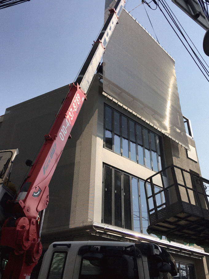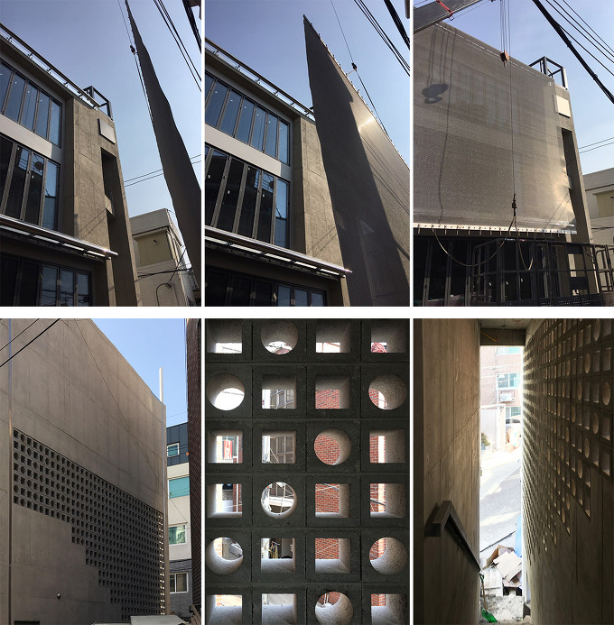 - 차면기능 및 외부입면이 하나로 보일 수 있는 장면을 위해 메탈패브릭 재료 선정 및 더블스킨으로 입면 디자인