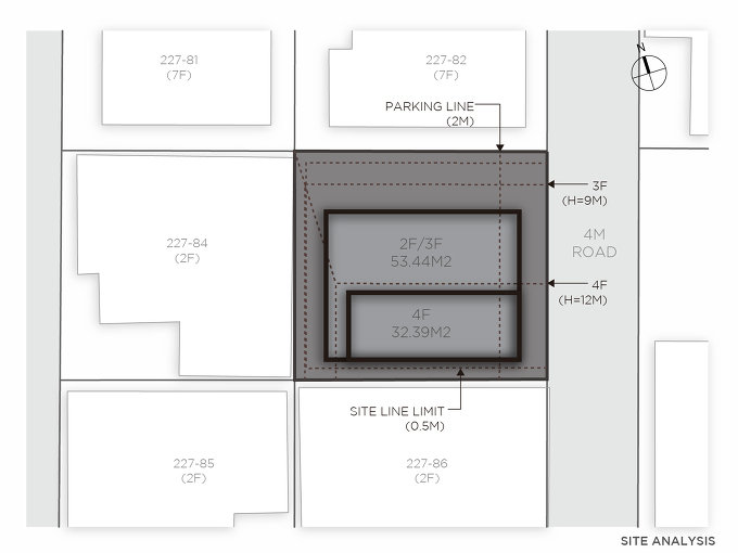 주변건물현황: 남측, 서측 기존 2층 높이의 건물 인접 (0.5m 이내) / 북측 7층 높이 건물 신축