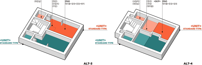 ALT1: 주거2,3,4층: 4층은 독립적으로 사용이 힘들고, 3층과 연계하는 복층형 유닛구성이 합리적