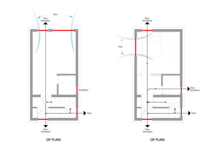 2층부터 4층까지 공통으로 배면에서 정면으로 깊어지는 정주 공간의 연결 선상에서 동선축 양 끝단에 창을 계획, 조망점을 연결하여 공간의 개방감을 최대한 확보합니다. 물론 층마다 실의 특성에 따라 창의 크기는 달라집니다. 이렇게 마주하는 창을 통해 환기는 자연적으로 해결됩니다.