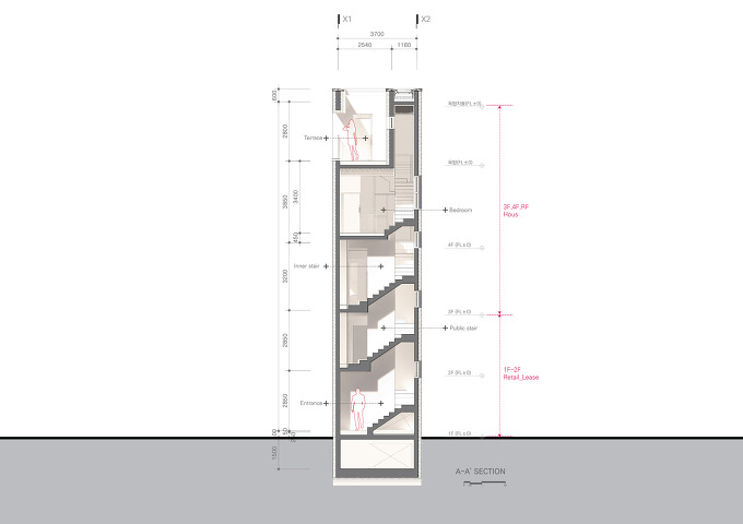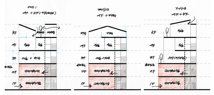 - 상가주택으로서 근생용도계획, 저층부 배치 --> 3층에서 단독주택의 시작