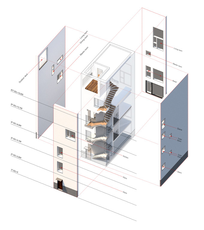 협소주택에서 창의 계획은 공간의 물리적 거리가 작아 공간의 관계 정리를 통해 더욱더 세심한 계획이 필요합니다. 한정된 내부공간에서 외부공간과의 확장(OPEN) 및 경계(CLOSE)를 만드는 창을 공간과의 관계 정리를 통해 중첩하여 계획 하였을 때 창은 공간의 개념을 같이 가져가게 되고 시각적으로 작은 공간을 확장할 수 있는 매개체가 되기 때문입니다.