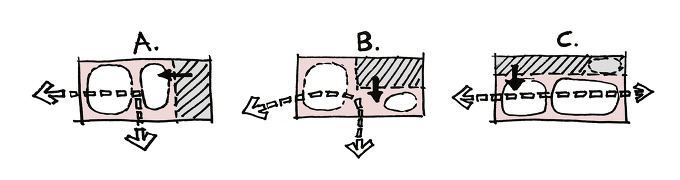 계단이 어디에 위치함에 따라 정주공간과 부공간 설정이 가능합니다. 수직 동선(계단)을 한쪽에 위치하는 것이 정주공간을 효율적으로 사용할 것 같지만, 화장실과 같은 부공간 계획 및 오픈계단과 정주공간이 맞물리는 계획을 고려한다면 위의 다이어그램과 같이 계단 계획은 다양한 위치로 대안설정이 가능합니다.