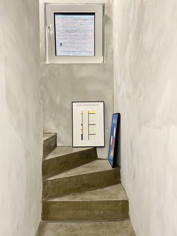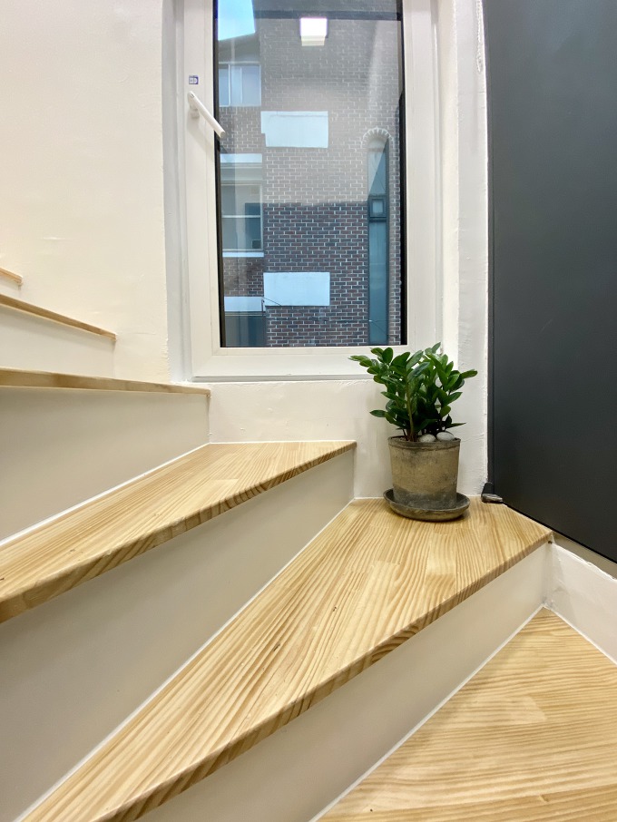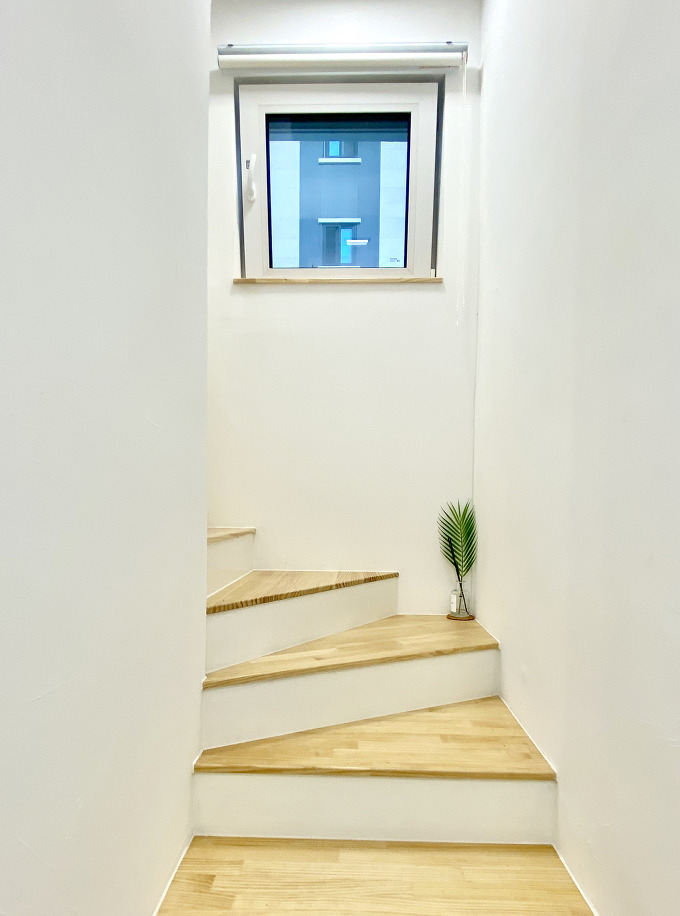 후면도로의 현관부터 시작되는 최소 크기로 계획된 공용계단은 좁은 공간의 한계를 극복하기 위해 동선상에 창을 배치함으로써 시각적으로 공간을 확장할 수 있도록 계획합니다. 우측면과 인접 건물의 관계를 기준으로 최소한의 창을 동선상에 배치합니다.