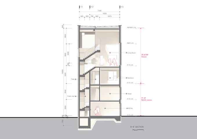 - 상가주택으로서 근생용도계획, 저층부 배치 --> 3층에서 단독주택의 시작