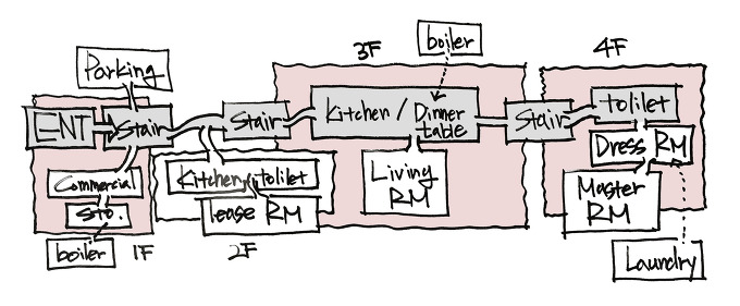 각 층을 연계할 계단과 동선이 어느 공간과 물리면서 연속될 것인가를 고민합니다. 거주자 입장에서 보면 동선을 효율적으로 구성하는 것이 좋습니다. 한 층에 담을 수 있는 프로그램이 한정적이기 때문에 선택과 집중은 필수 입니다.
