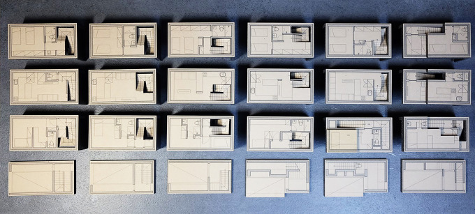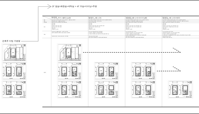 여타 협소주택처럼 여유 있는 크기는 아니지만 건축주 본인 거주 목적에 임대수익을 올릴 수 있는 협소 상가주택을 시작합니다. 인터뷰를 통해 건축주에게 주거로 필요한 소요공간을 산정하고 대지가 가지고 있는 볼륨을 여러 요소들과 조율하며 상가의 적정면적을 만들어 나가게 될 것입니다. 전면과 후면에서 접근 가능한 대지특성을 설계에 잘 녹여낸다면 방법을 찾을 수 있을 것입니다. 6가지 대안은 기본 설정한 프로그램을 바탕으로 주차방식과 주출입구 방향 그리고 전체 동선체계를 정리할 계단 위치를 각기 다른 지점에서 검토한 결과물로 이번 프로젝트에 첫 단추가 되어줄 것입니다.