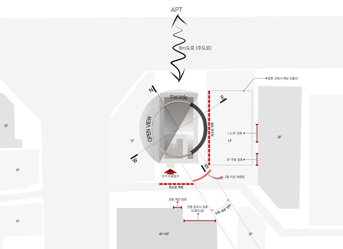 - 8m도로 부분 공지부분 최대 확보 1층 상가 주출입 계획