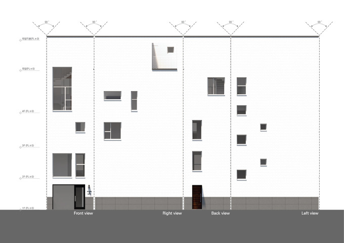 도심지에 협소주택을 계획할 때 많은 경우 이웃과의 거리가 매우 가깝습니다. 이러한 이유로 입면 계획을 위해 인접 건물 및 주변 대지환경과의 관계설정부터 시작합니다. 주변 건물의 용도 및 높이, 창의 위치 검토를 통한 인접 건물과의 관계설정, 주도로와의 관계설정을 통한 건물의 정면성을 가져야 할 범위 설정, 마지막으로 조망이 가능한 범위, 채광의 범위 등의 관계설정을 통해 아래와 같은 당산동 협소 상가주택 창 계획의 시작점을 만듭니다
