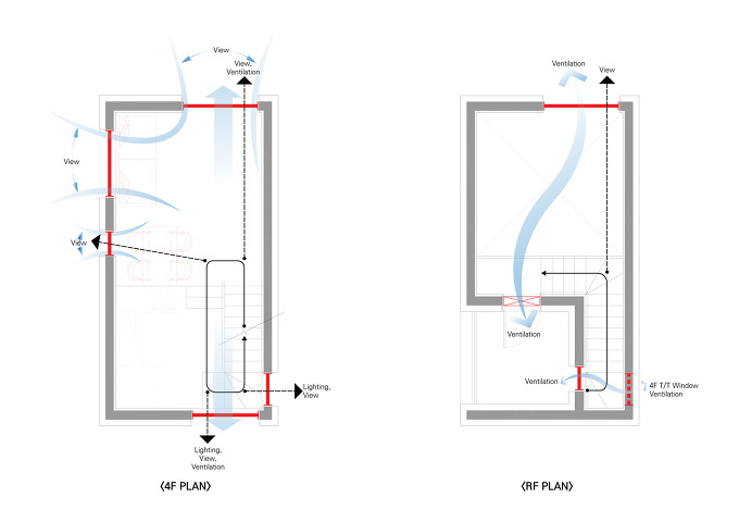 협소주택에서 창의 계획은 공간의 물리적 거리가 작아 공간의 관계 정리를 통해 더욱더 세심한 계획이 필요합니다. 한정된 내부공간에서 외부공간과의 확장(OPEN) 및 경계(CLOSE)를 만드는 창을 공간과의 관계 정리를 통해 중첩하여 계획 하였을 때 창은 공간의 개념을 같이 가져가게 되고 시각적으로 작은 공간을 확장할 수 있는 매개체가 되기 때문입니다.