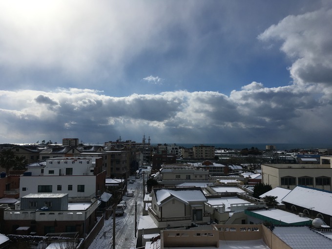 불과 몇분 상관으로 폭설이 그치고 해가 나온다. 저 골목길을 따라 6-7분만 걸어가면 모슬포항에 닿는다.