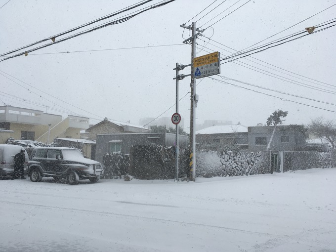 제주도는 제설을 안하는지, 갑자기 내린 폭설로 인하여 어쩔 수 없는 상황인지, 눈만 보이는 도로를 엉금엉금 헤쳐간다.