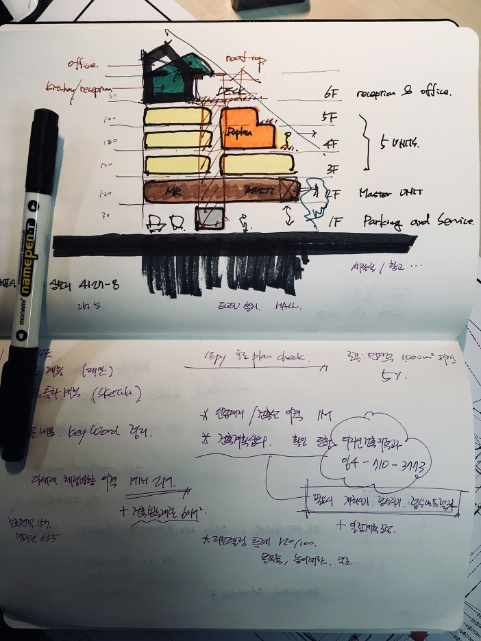 건축주의 생각을 구현하기 위한 결과물이 빨리 결정되는 경우도 있지만, 많은 경우의 수를 조합하다보면 (세세하게 맞추다 보면) 설계의 시간이 길어진다. 물론, 약속된 시간안에서 진행된다. 단계를 밟아 나갈때마다 중요 지점에서 좀 더 신중하게 다음 단계의 진행을 고려하게 된다.