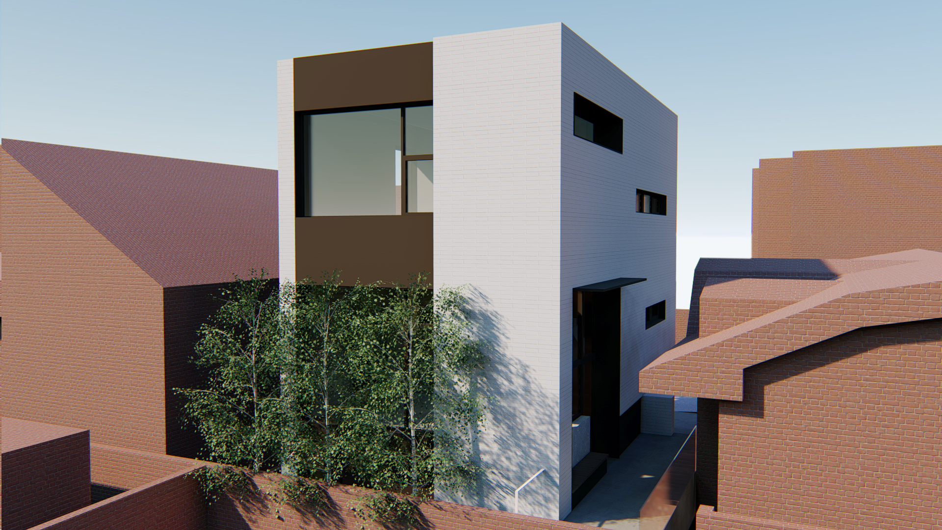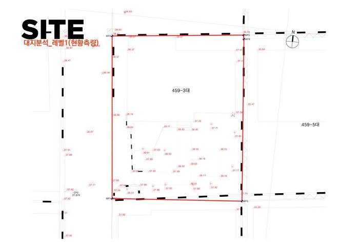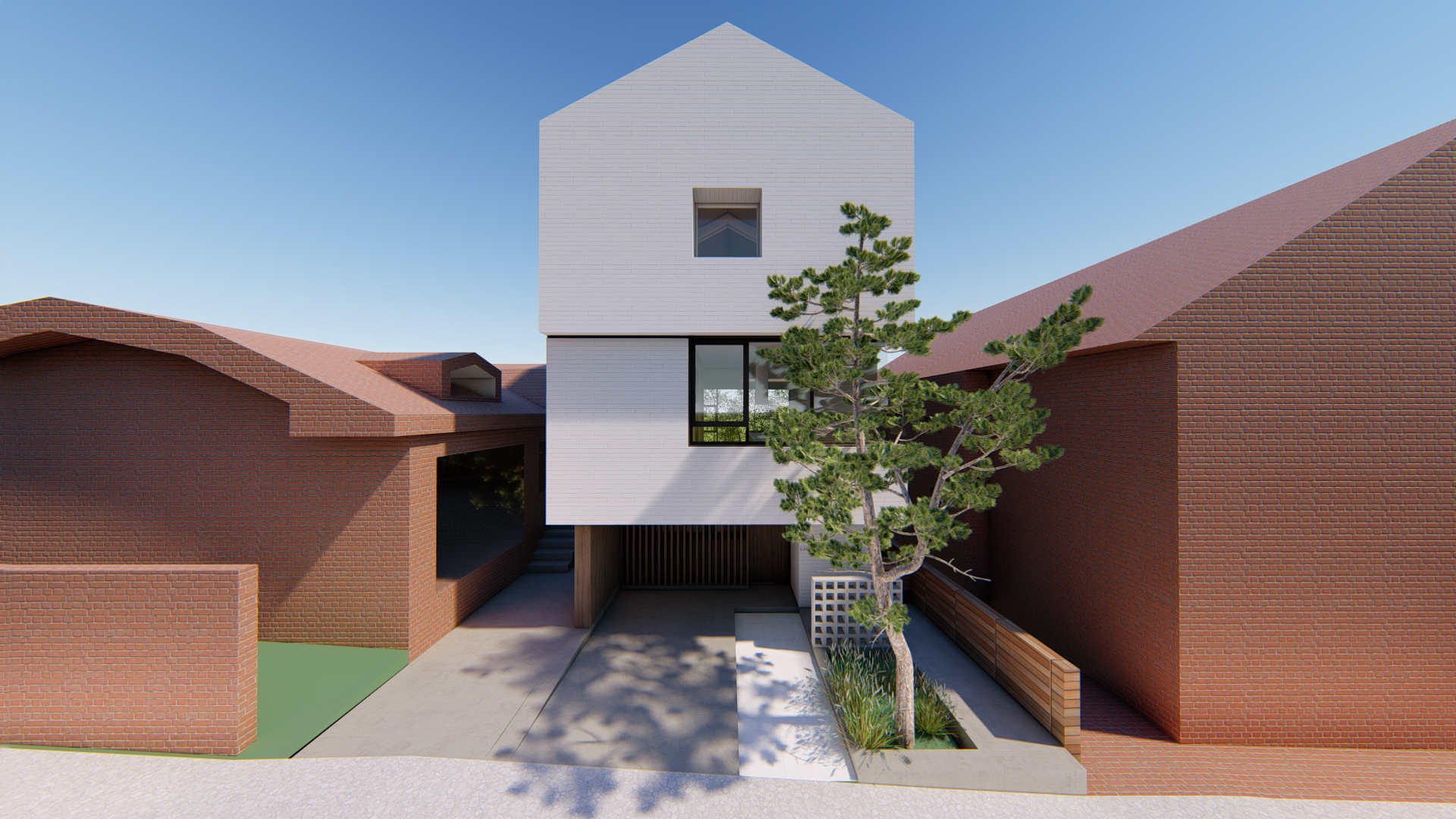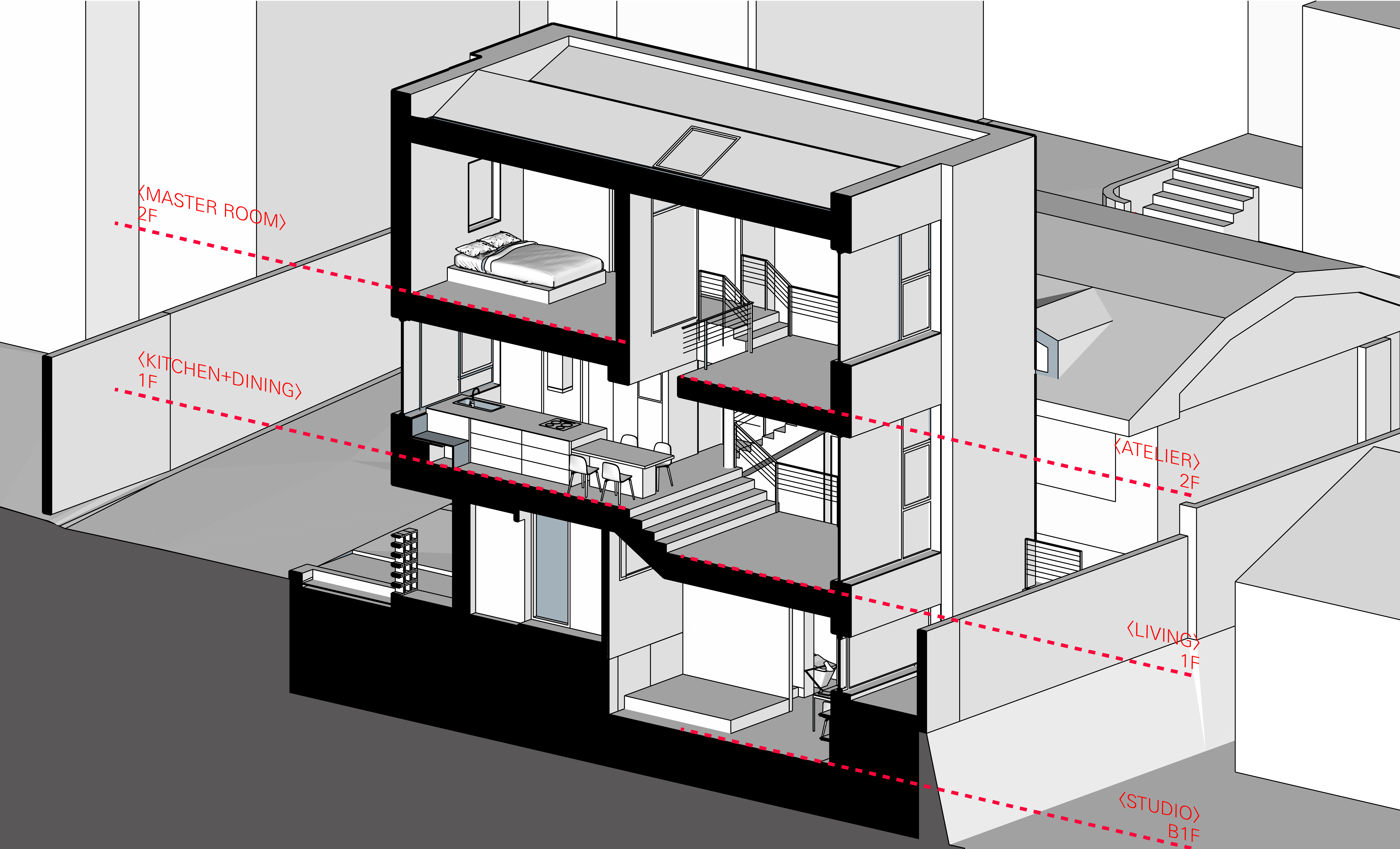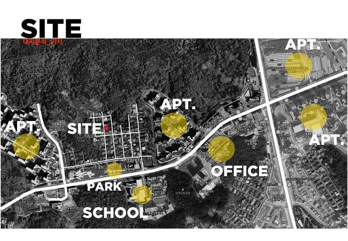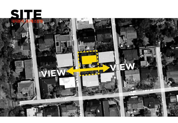 스플릿레벨로 구성된 내부 프로그램과 별개와 외관 디자인은 두가지 방향에서 접근합니다. 도시적 맥락을 연결하는 모던한 주택 이미지와 기존건물 및 이웃한 건물의 박공지붕의 풍경을 연속하는 코지한 주택의 이미지 입니다.