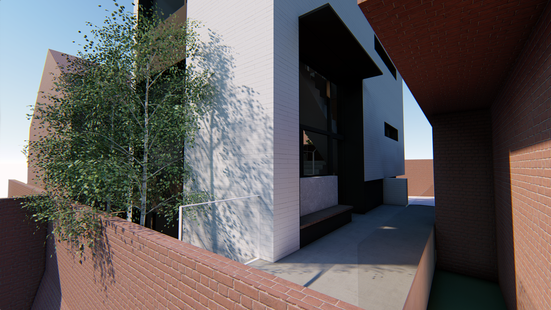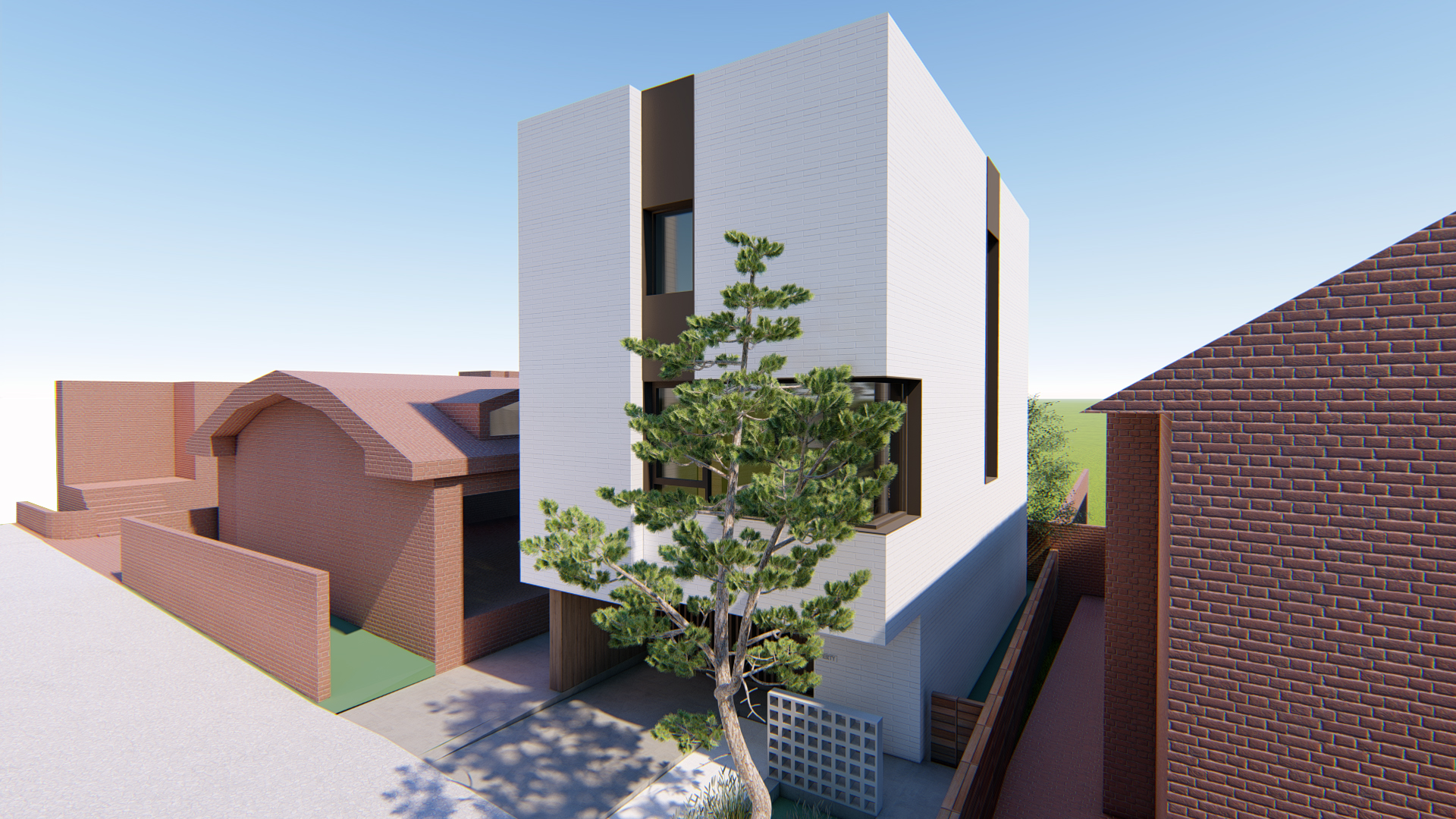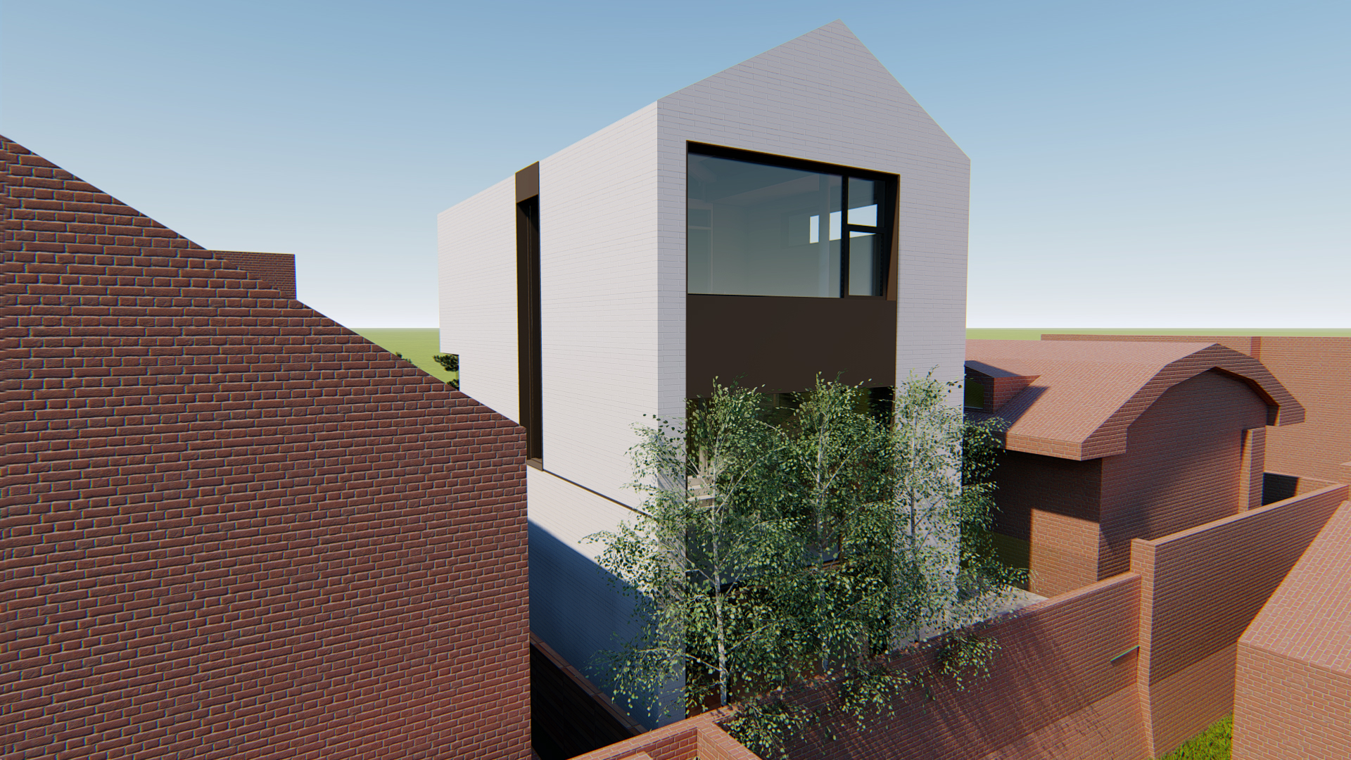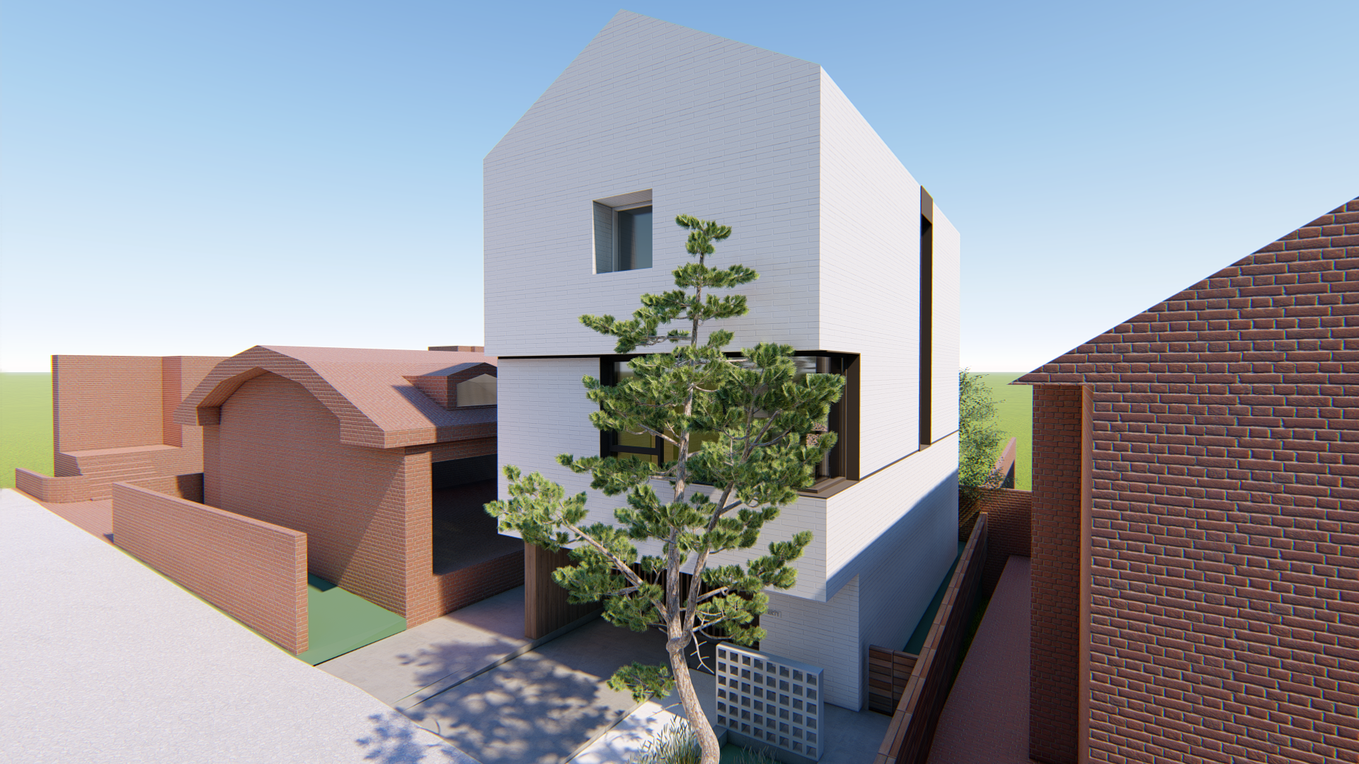 스플릿레벨로 구성된 내부 프로그램과 별개와 외관 디자인은 두가지 방향에서 접근합니다. 도시적 맥락을 연결하는 모던한 주택 이미지와 기존건물 및 이웃한 건물의 박공지붕의 풍경을 연속하는 코지한 주택의 이미지 입니다.