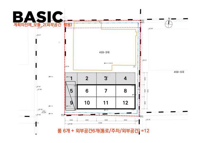 12개의 모듈에서 시작합니다. 그중, 내부공간(건축공간)으로 6개를 사용하고, 6개는 외부공간에 할애합니다. (한 모듈은 3평; 1ROOM을 기준합니다.)