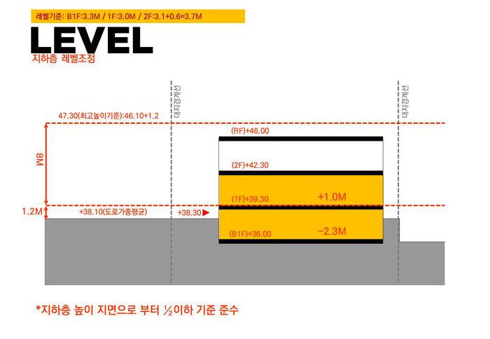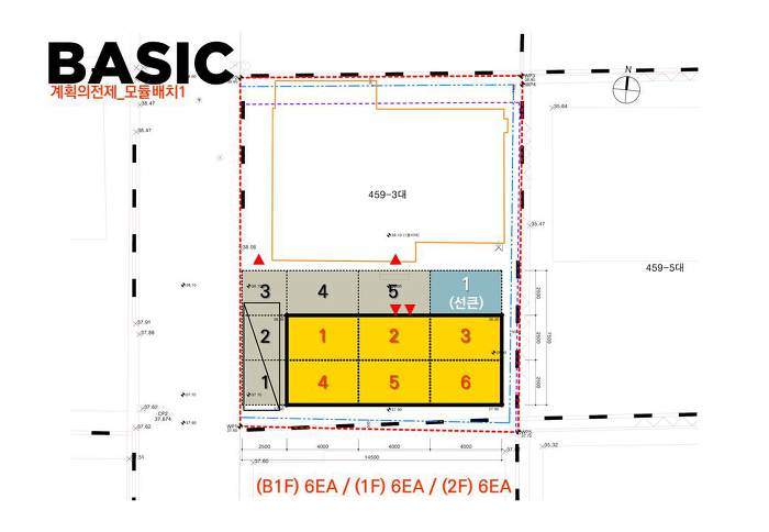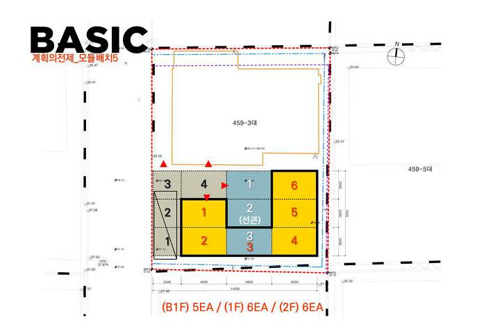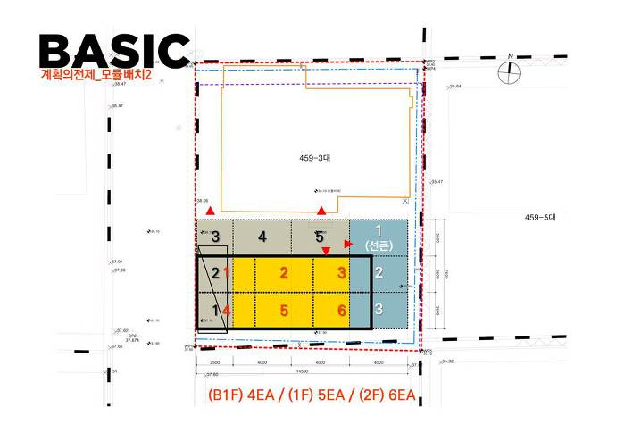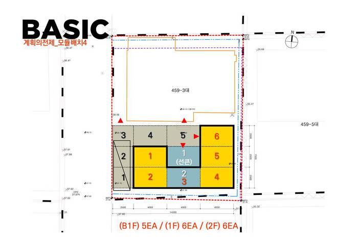 2. 기본 모듈을 서측으로 최대한 위치 시킵니다. 지하 선큰을 동측 3개 모듈로 적용, 지하환경을 최대한 개선합니다. 대신 1층 전면(서측)주차공간과 지하공간에 자리를 내어준 만큼 최소화 계획입니다.