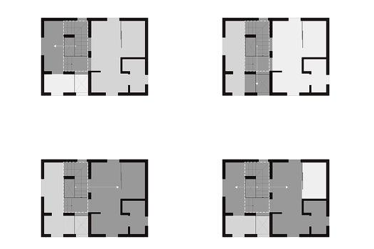 -작은 공간들 하나로 읽게 만들기 (A) 두개 이상의 주공간을 한층에 배치하기에는 바닥면적이 협소함 (B) 주공간과 부공간으로 평면을 조닝. 2층, 3층 주공간에 주방과 침실을 각각 배치 (공용과 사적공간의 분리) (C) 주공간, 부공간 사이의 중첩공간; 계단과 단차공간을 삽입(사용자의 설정 또는 설계자의 의도에 따라 가변적으로 공간 활용 가능) (D)주방을 기점으로 웰컴공간과 거실은 400mm 아래에 위치, 리딩누크와 서재는 2300mm 위에 위치. (E)주방과 웰컴공간은 2개의 계단으로 연결, 주방과 거실은 벤치(좌석)으로 연결 또는 분리 (F)주방과 리딩누크는 13개의 계단으로 연결. (G)식당을 포함한 주방과 거실, 웰컴공간, 리딩누크는 하나의 공용공간으로 활용(동선을 짧게, 편리하게 이동이 가능하도록 설계) (H)침실에서 500mm 아래에 리딩누크와 서재가 위치. 브릿지를 통해 연결(브릿지는 2개의 보이드공간을 만듬) (I)갤러리 창문과 포켓도어는 침실을 집속의 집처럼 개별적인 공간으로 분리를 시킴.