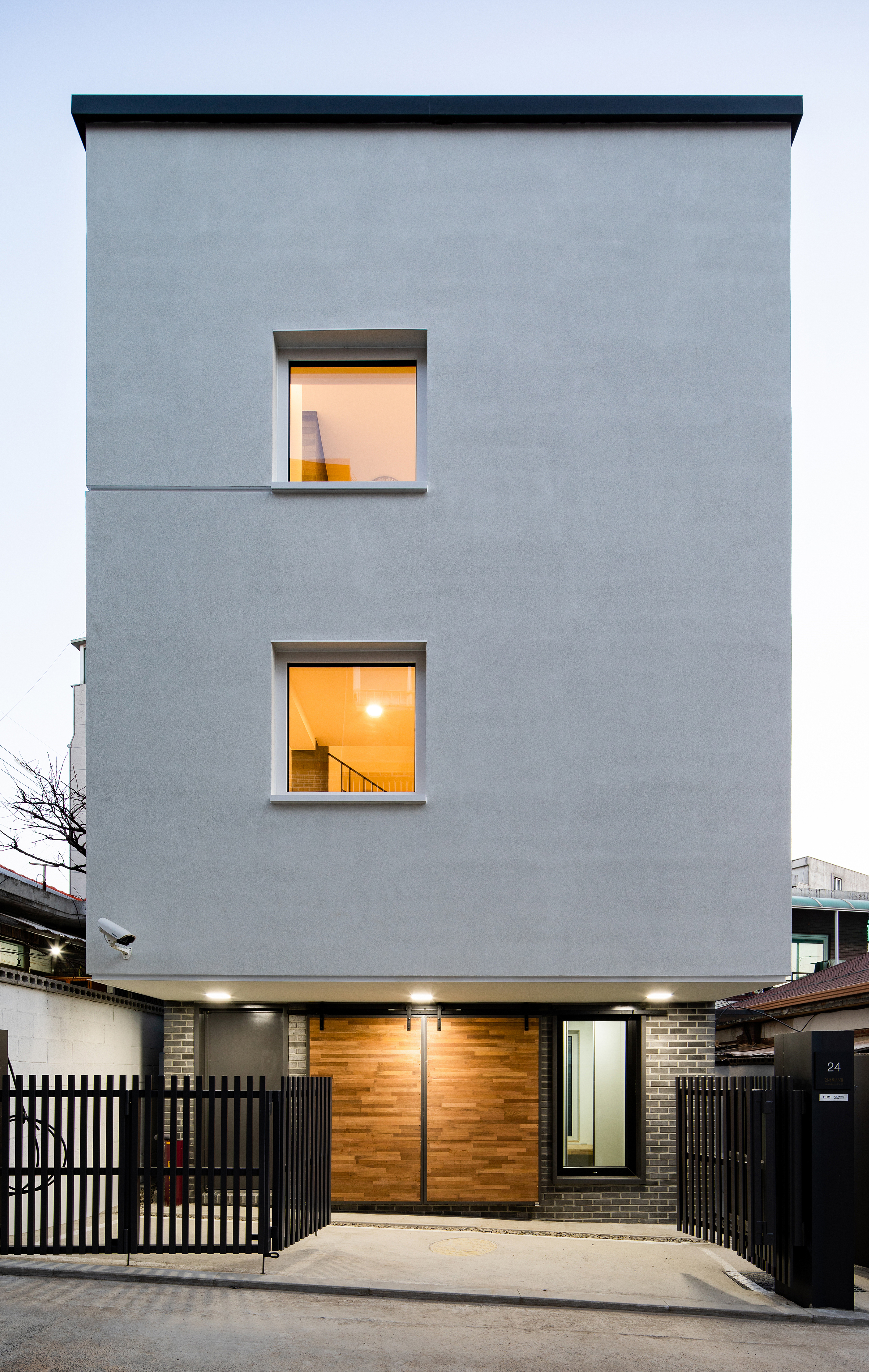 서측, 도로에서 보이는 입면과 외부공간은 주출입구(게이트)와 주차만 담습니다. 상층부 입면 또한 담담히 만듭니다. 기존 가로환경에서 도드라지고 돋보일 생각은 없지만, 다듬어진 백색형태가 주위에서 눈에 띄는 것은 사실입니다. 의도적으로 상부 백색과 대비되도록 1층은 회색벽돌을 적용합니다. 게이트(주차장폴딩도어)를 회색을 디자인한 것처럼 가로환경와 맞물리도록 설정합니다.