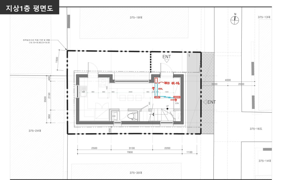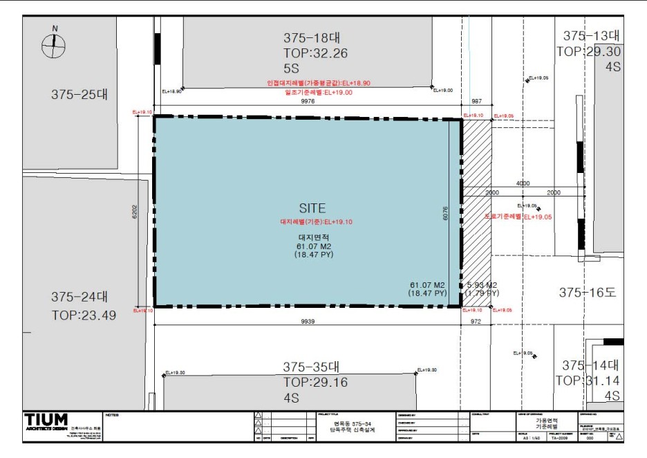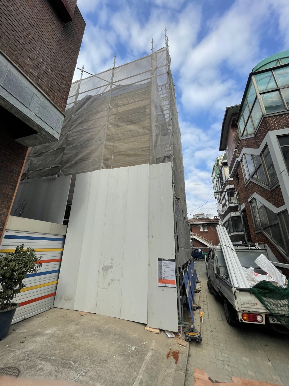 동측 4m도로를 제외한 남서북측에 건물이 인접해 있는 상황. 게다가 건물 일부분은 이웃한 집과 담장 또는 건물벽체 일부분을 공유하고 있는 상황.