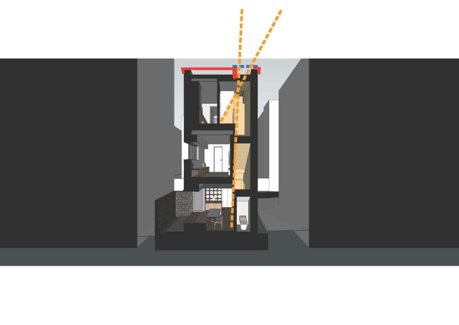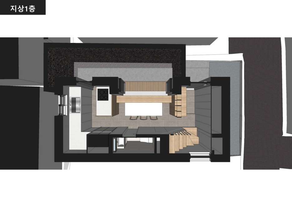 공용공간과 개인공간(침실)을 수직으로 분리하는 프로그램. 1층을 주방,식당공간으로 제안, 외부로 확장하여 사용.
