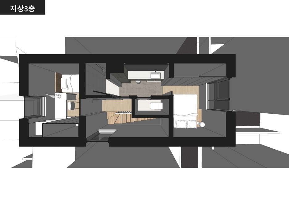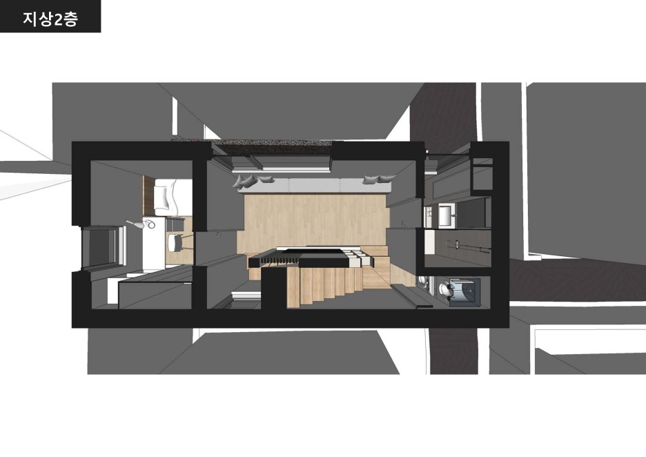 2층 거실 배치, 1층과 분리된 세컨드 공용공간 구성. 메인침실을 포함한 3개의 침실은 서로의 크기에 따라 짝을 이루며 배치함, 2층 공간에 거실과 침실을 배치하며, 3층에는 메인침실과 침실을 배치함.