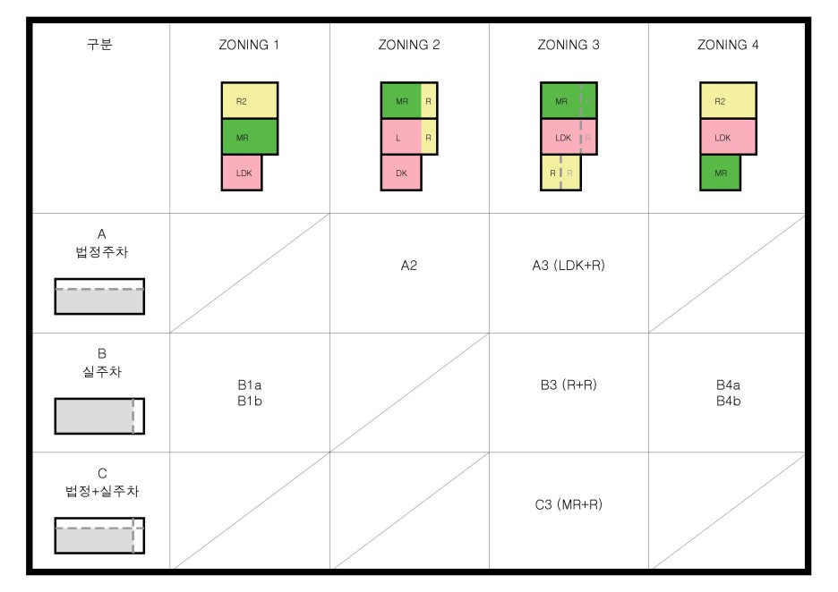 공용공간의 위치에 따라 각자의 생활공간을 배치함.