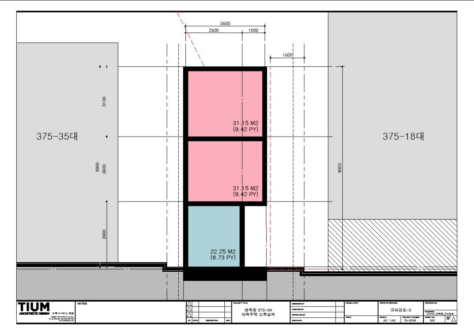 건축면적은 대지면적의 60%에 해당하는 31.15㎡(약9평)이며, 연면적을 찾기 위한 층수는 3개층 규모까지 가능함.(대지의 장변방향으로 정북사선이 적용되어, 4층부터는 건축공간 형성이 어려움)