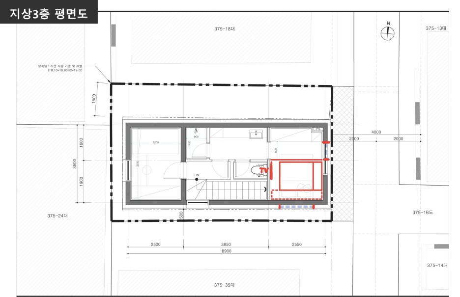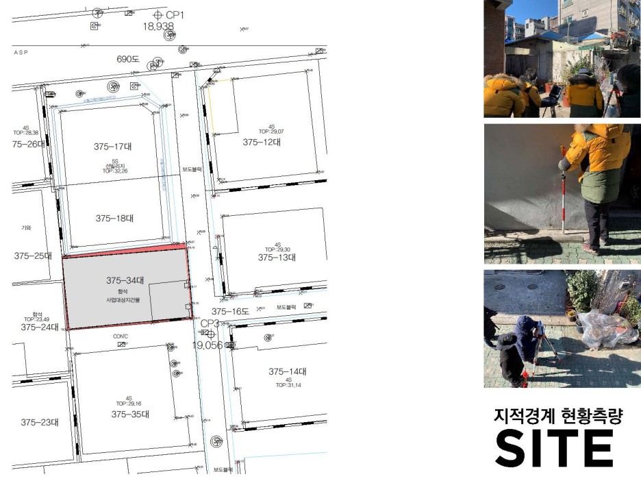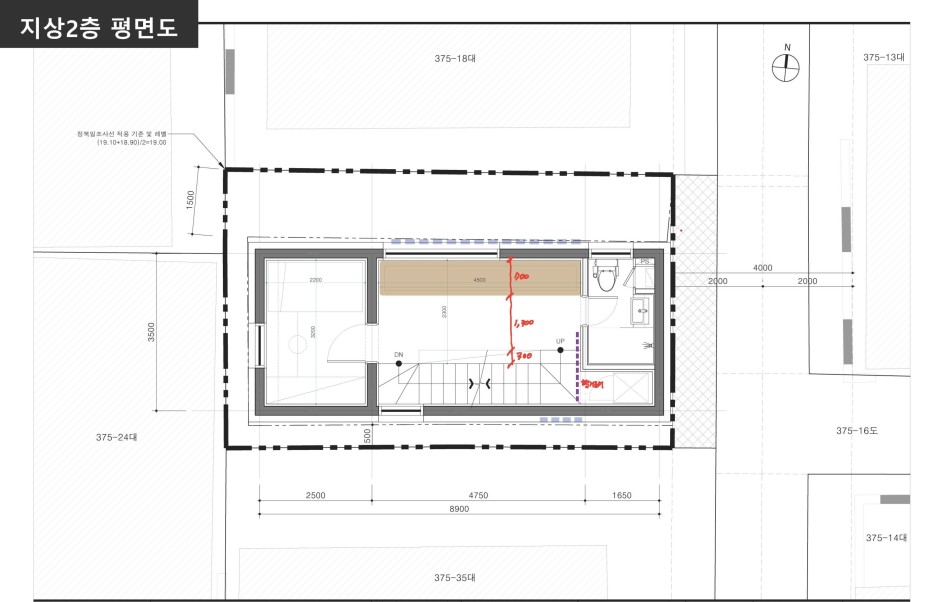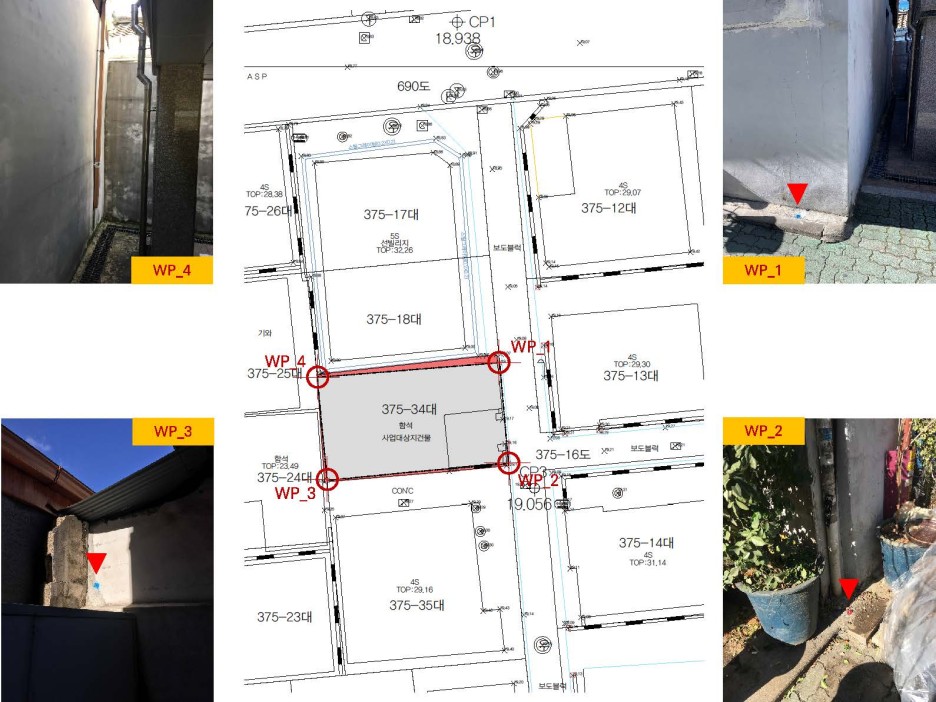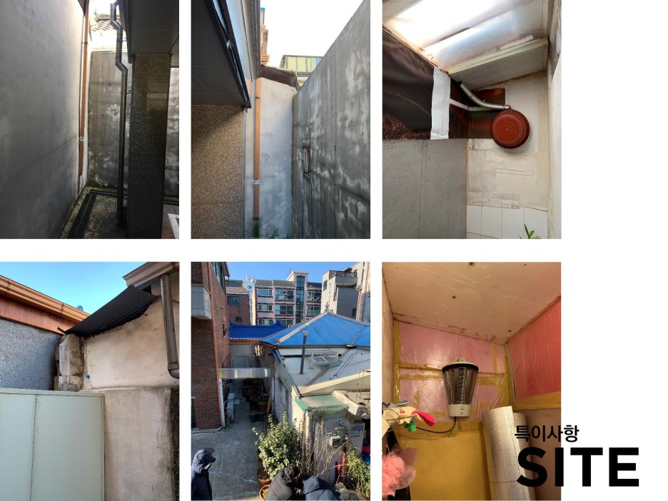 동측 4m도로를 제외한 남서북측에 건물이 인접해 있는 상황. 게다가 건물 일부분은 이웃한 집과 담장 또는 건물벽체 일부분을 공유하고 있는 상황.