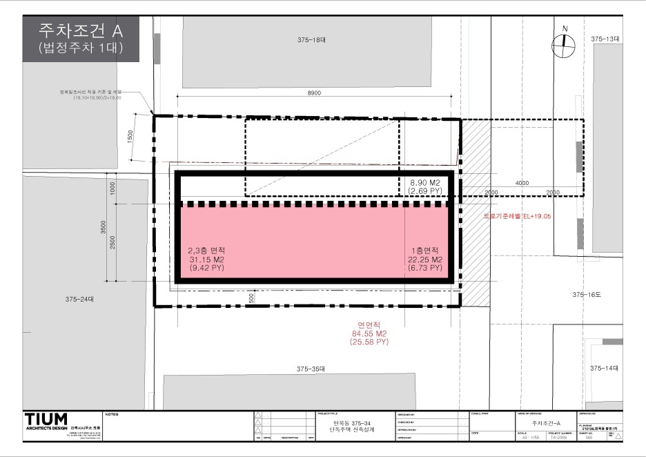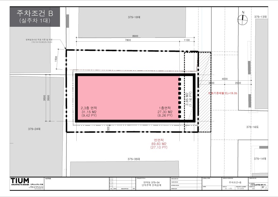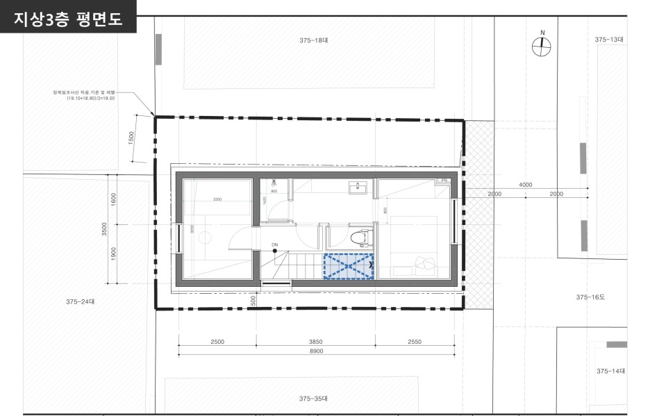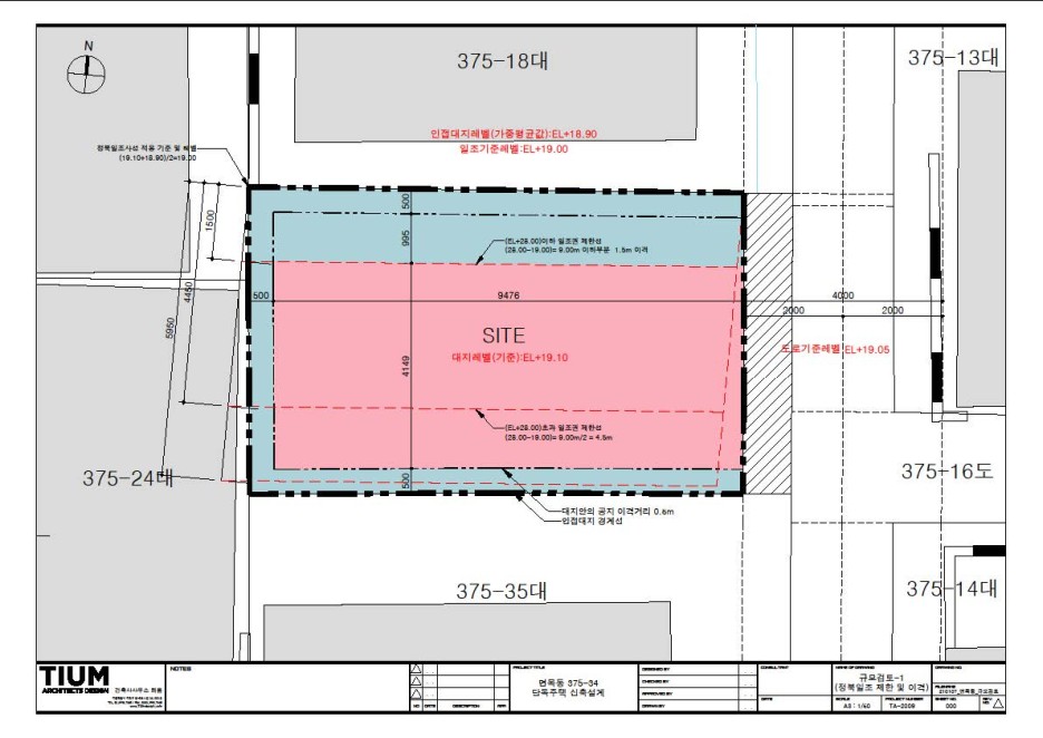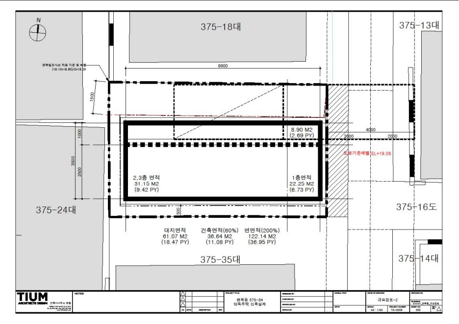 건축면적은 대지면적의 60%에 해당하는 31.15㎡(약9평)이며, 연면적을 찾기 위한 층수는 3개층 규모까지 가능함.(대지의 장변방향으로 정북사선이 적용되어, 4층부터는 건축공간 형성이 어려움)