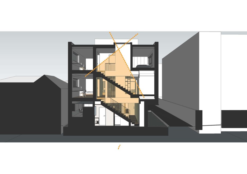 2층 거실 배치, 1층과 분리된 세컨드 공용공간 구성. 메인침실을 포함한 3개의 침실은 서로의 크기에 따라 짝을 이루며 배치함, 2층 공간에 거실과 침실을 배치하며, 3층에는 메인침실과 침실을 배치함.