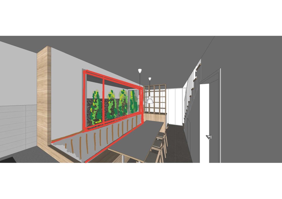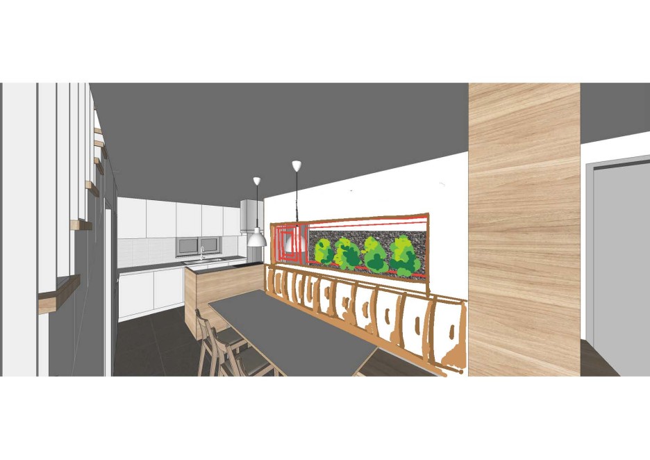 공용공간과 개인공간(침실)을 수직으로 분리하는 프로그램. 1층을 주방,식당공간으로 제안, 외부로 확장하여 사용.