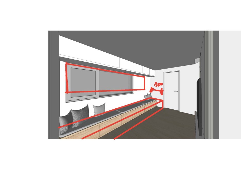 5. 2층 거실 : 북측 창호는 프라이버시 확보하는 방향으로 설치 (작고 가로로 긴창 형식 고려) / 2층 수납형 벤치는 700mm로 확대 설치 (전면부 통로 확보 및 화장실 문과의 간섭 고려)