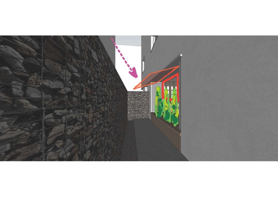 정원 : 알코브(외부에 화단+어닝 설치)+고정형 벤치(등받이 부분까지 벽체 설치)+LS창호(고정+부분 환기창)