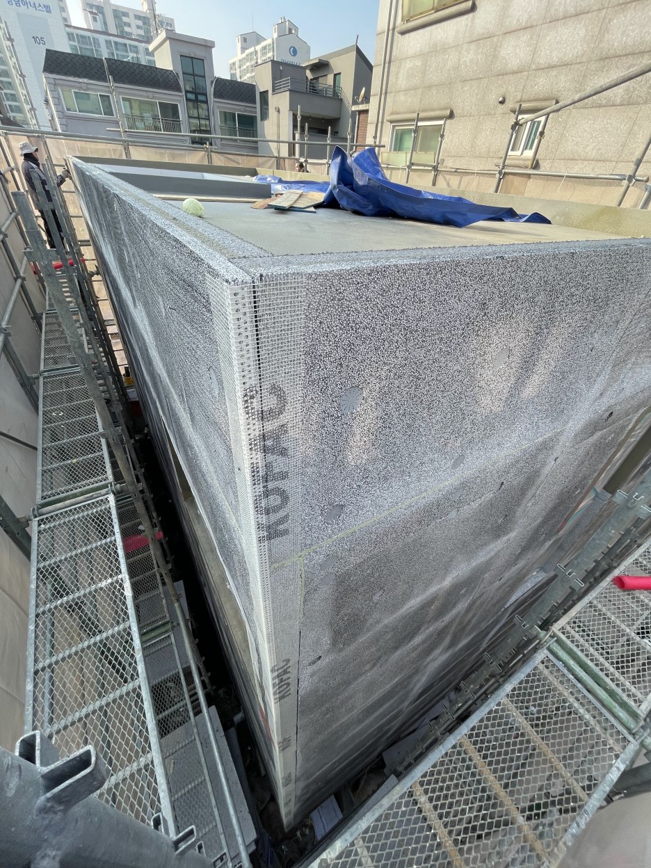 면목동에 적용한 스토(STO)는 Linear 10 제품에 핑크컬러를 매치한 결과물로 예상했던 것보다 고유한 분위기를 만들어 낸다. 핑크컬러가 주변으로 부터 분리된 튀는 이미지를 만들 것 같은 우려와 달리, 이웃한 붉은색 벽돌건물과도 어울리고, 전체 동네분위기와도 파스텔톤으로 잘 맞아 들어간다. 원래 그렇게 자리 했던 것처럼 자리한다. 우리가 하는 건축처럼 자연스럽게 장소에 위치한다.